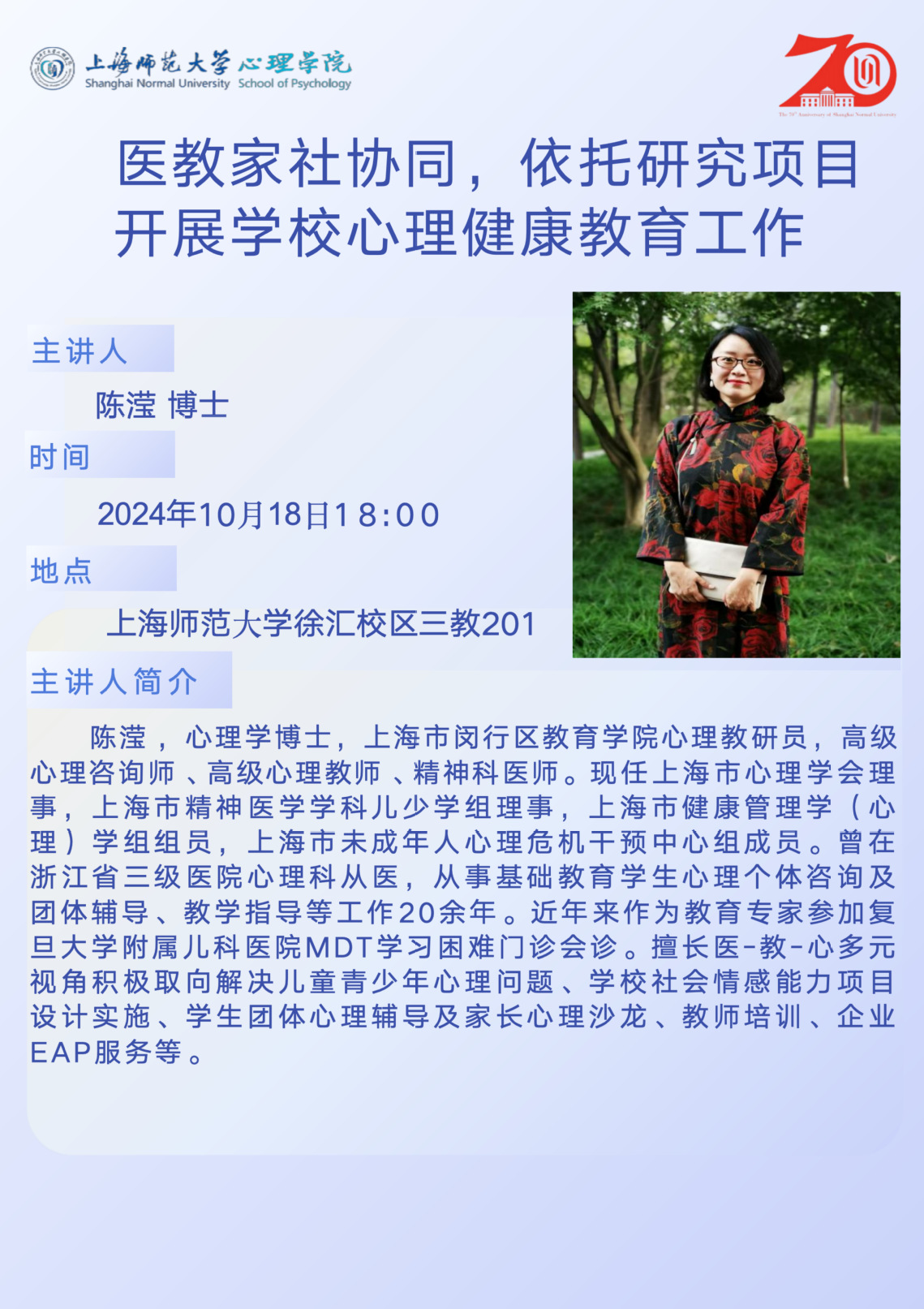 2024年10月18日下午,在365英国上市网站官网70周年校庆之际,闵行区教育学院心理教研员陈滢博士应邀为365英国官网师生作《医教家社协同,依托项目研究开展学校心理健康教育工作》的主题讲座,讲座由王怀勇副教授主持,40余位师生参加讲座并与陈滢博士进行了交流互动。