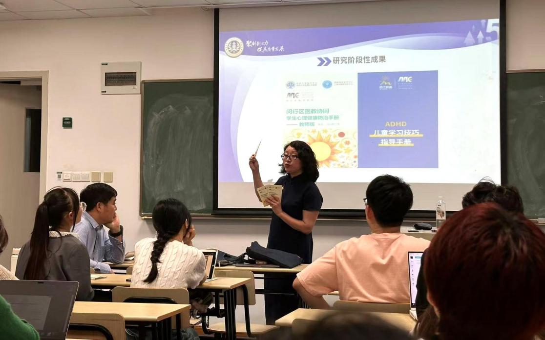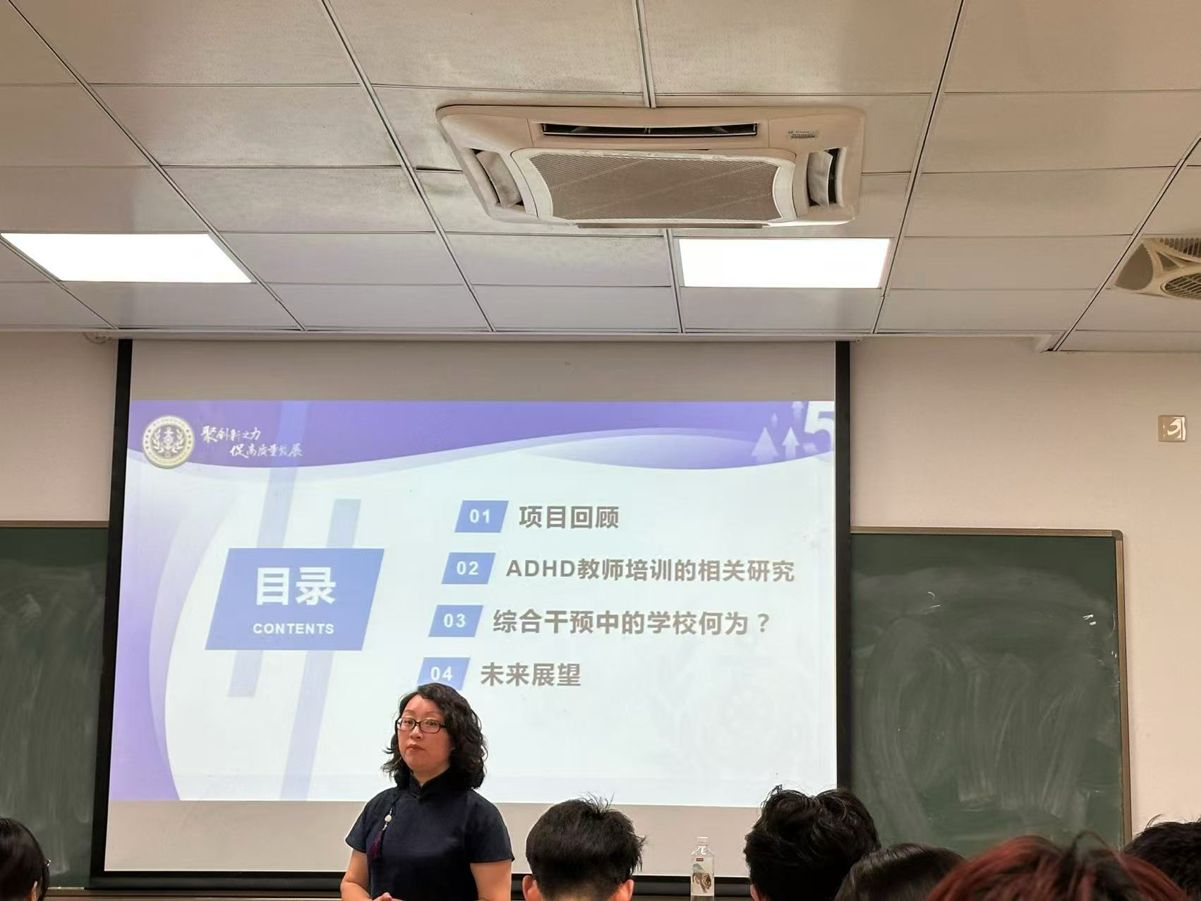 在讲座中,陈滢博士首先跟大家分享了自己的职业发展经历,从心理科医生到中职专职心理教师,再到德育管理人员,以及到如今的心理教研员,正是这种丰富多样的成长经历为其深耕学校心理健康教育领域工作打下了坚实的基础。她鼓励同学们平时不仅要重视学习的深度,更要加强学习的广度,要善于发挥自身跨专业、多学科的背景优势深入学习研究。接着,陈滢博士基于所主持的ADHD儿童的医教家社协同项目,详细介绍了如何对ADHD进行综合干预以及学校在其中应该怎么做。最后,陈滢博士重点围绕如何对ADHD教师进行培训向大家介绍了其长期实践探索所发现的有效指导策略。