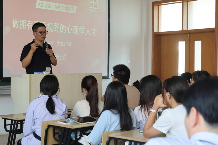 罗俊龙教授以“做拥有国际视野的心理学人才”为题向同学们分享经验与见解。罗教授提出大家作为心理学人,应广泛阅读外文文献,紧跟国际心理学领域的前沿研究成果。同时他结合自己读博时期亲身申报交换生的经历,强调了外语听说能力的重要性。