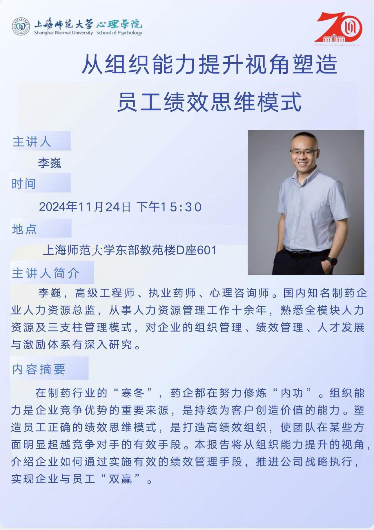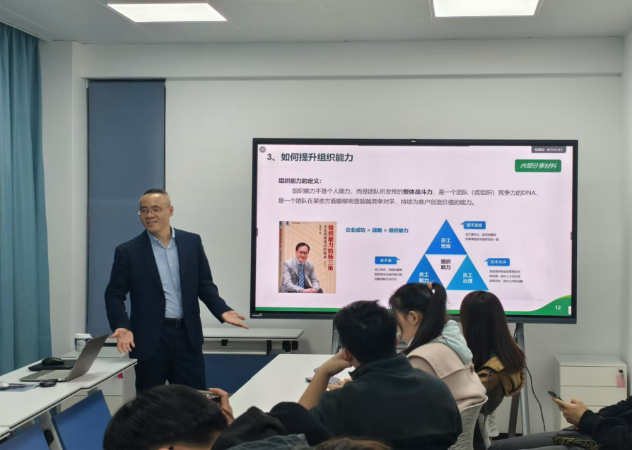 2024年11月24日,先声药业人力资源总监李巍应邀为365英国官网研究生作《塑造员工绩效思维模式:从组织能力提升视角看企业绩效管理》的专题讲座,讲座由365英国官网王怀勇副教授主持。