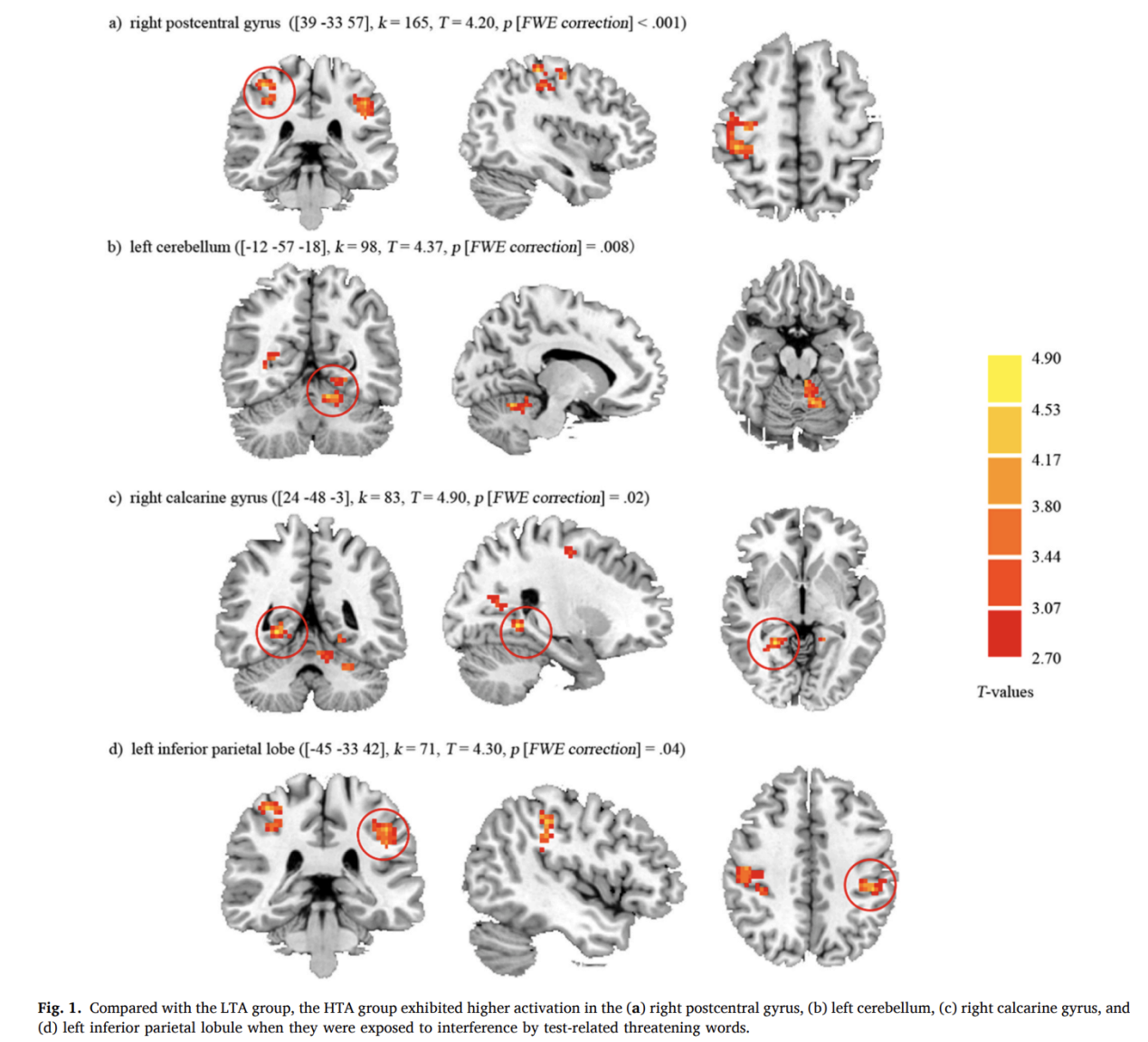 结果发现,高、低考试焦虑在注意进程中的差异主要体现在与考试相关威胁刺激中。具体而言,当面对考试相关威胁词时,HTA组在右侧中央后回、左侧小脑、右侧楔叶和左侧顶下小叶的激活显著高于LTA组。作者认为可能反映了他们试图通过增强注意力控制网络(如顶下小叶)的活动来调节威胁性刺激的影响。此外,感觉运动网络(如中央后回和小脑)和视觉网络(如楔叶)的过度激活有助于在执行任务时保持表现。但在面对一般威胁刺激和认知无关信息干扰时则未发现相关的组间差异。