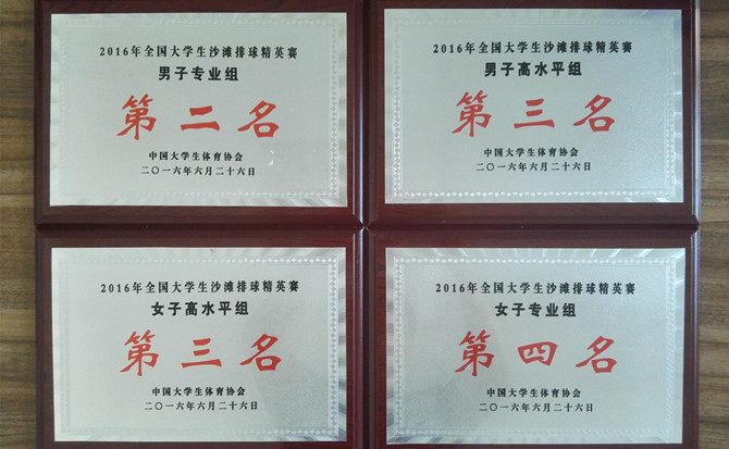 2016年6月23日至26日,全国大学生沙滩排球精英赛在宁夏银川举行。今年会官方网站四支沙滩排球代表队分别荣获男子专业组第二名,男子高水平组第三名,女子高水平组第三名,女子专业组第四名的好成绩。