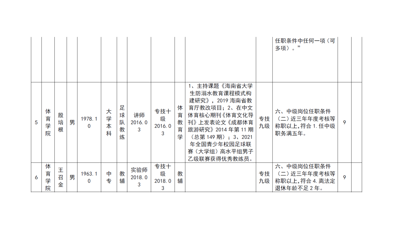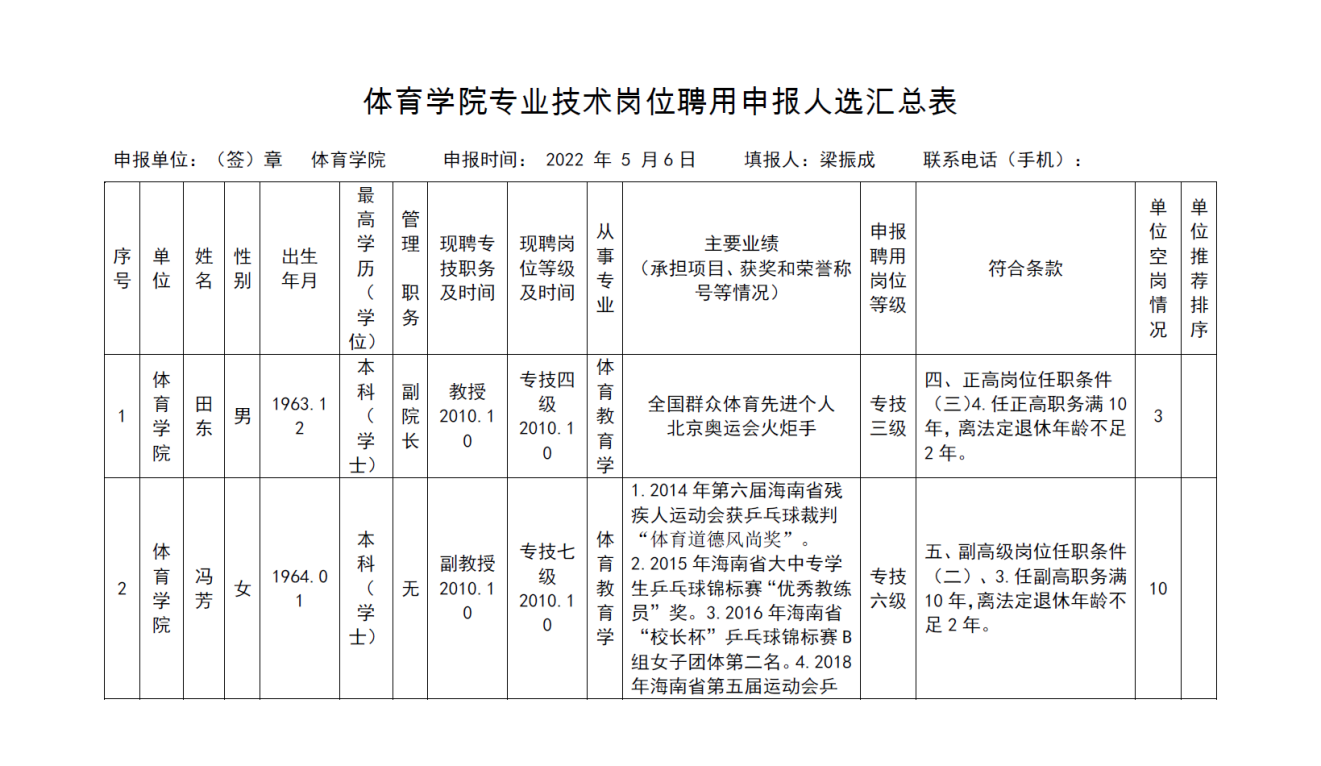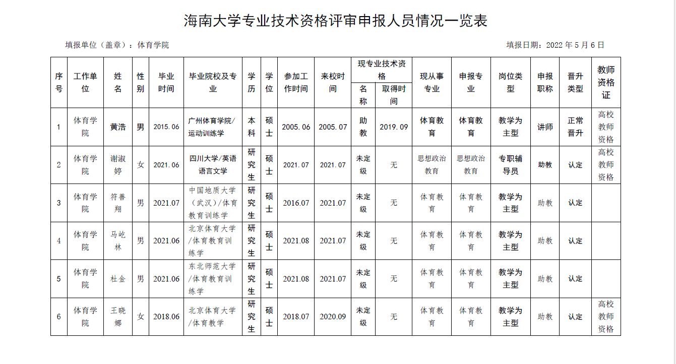 根据《海南省人力资源和社会保障厅关于我省事业单位岗位设置管理有关问题的通知》(琼人社发[2013]54号),《今年会官方网站岗位设置及聘用方案(修订)》(海大[2020]103号)等相关要求,由教职工本人申请,共有6名教师提出2022年度专业岗位聘用申请、10名教师提出专业技术评审和认定申请, 学院基层评审委员会审核,并票决全部通过。具体名单如下: