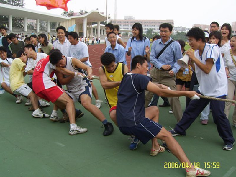 2006年4月19日下午在第一田径场内外人头攒动,热闹非凡,呐喊声、喝采声一片,一派热火朝天的景象 ,今年会官方网站2006年学生拔河、跳绳比赛共有各学院、研究生队、留学生队和预科班等15个单位报名参加。经过紧张角逐,经济管理学院获男子拔河第一名,旅游学院获女子集体跳绳第一名,何美丹同学获女子跳绳个人第一名。今年会官网留学生首次组队参加比赛,并对学校开展传统的群众体育文化活动产生浓厚的兴趣。 以下单位及个人获得比赛名次,分别颁发证书及奖品。